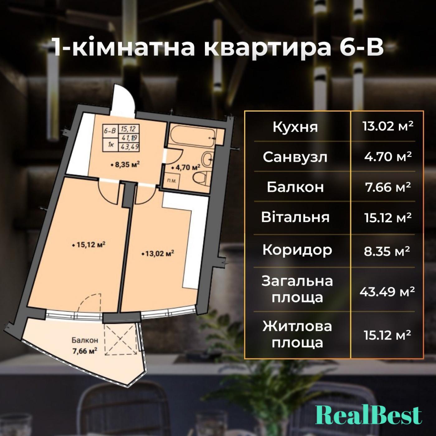 Загальна площа/житлова площа/площа кухні: 43,49 / 15,12 / 13,02